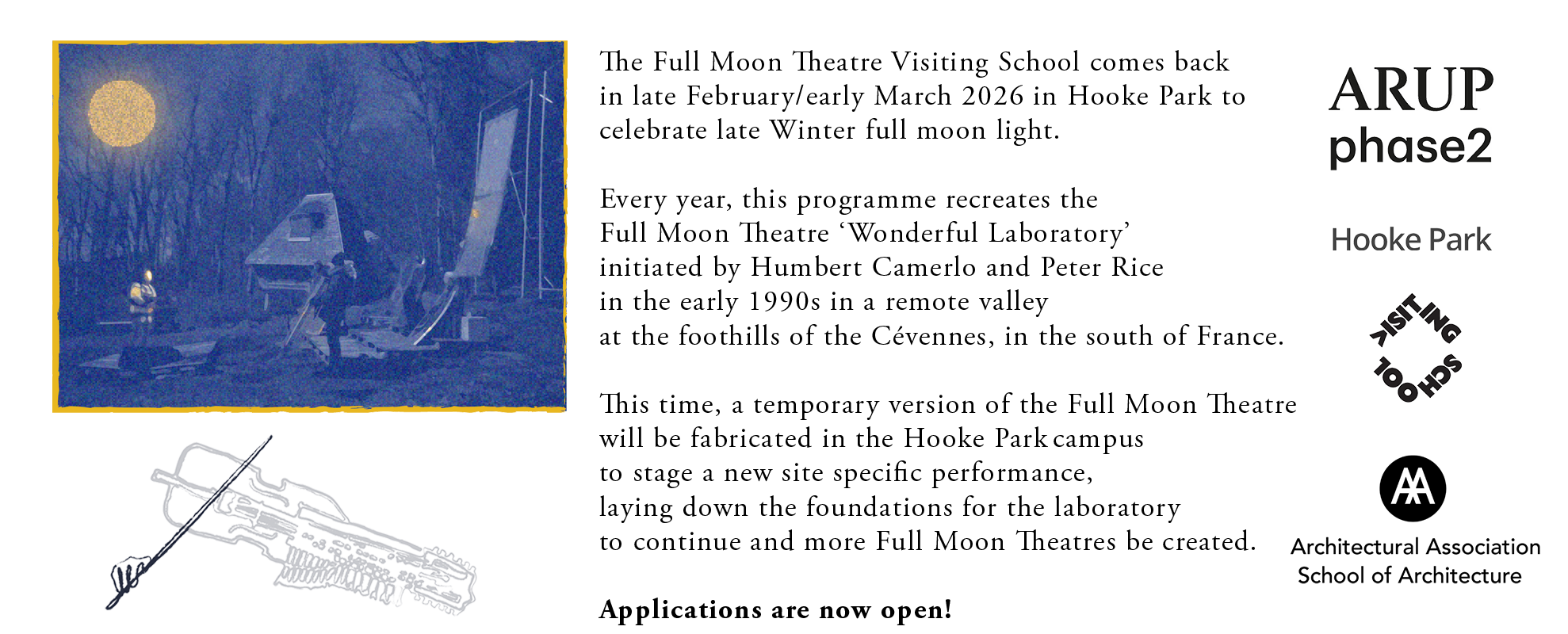 We are delighted to announce the successful completion of our 2025 workshop, co-organized by Full Moon Theatre’s technical director, Francesco Anselmo, and Design and Research lead, Yunni Cho. Hosted at the Architectural Association’s Hooke Park in Dorset, UK, and kindly supported by ARUP Phase 2, this year’s workshop brought together seven international participants to assemble and build reflectors of all shapes and sizes. In a unique collaboration with two locally based theatre companies—Angel Exit (co-directed by Tasmin Fessey and Lynne Forbes) and Teatro Vivo (co-directed by Kas Darley and Mark Stevenson)—we presented a theater play that reinterpreted the witches from Macbeth.